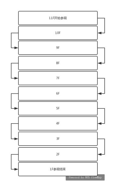 参观方式:本次参观共分七组,每组成员、负责人和集合时间详见附件。具体依据参观路线分批进行参观,间隔10分钟出发一批,先乘电梯至11楼,然后依次步行而下参观至1楼结束。