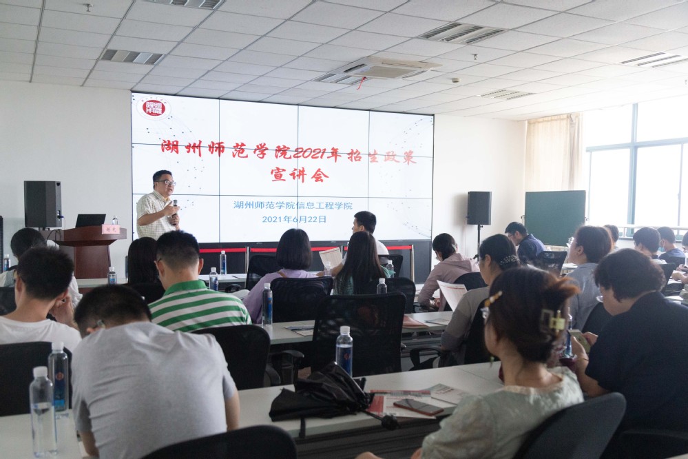 走出校史馆,代表团教师参观了校园,并在东校区优米直播视频听取了由安定书院、创新创业学院党总支书记谢杭带来的2021年招生政策宣讲。谢杭书记首先向到访代表团教师推介了“有山有水”的美丽城市湖州,希望更多人能“在湖州看见美丽中国”;随后,他围绕“新高考改革下如何做好高考志愿填报工作”的主题,从新高考改革的“总体要求、招生模式、录取规则、招生政策”等方面进行了解读;最后,他立足本校,详细介绍了湖州师范学院2021年招生政策,并重点解读了安定书院首届实验班“胡瑗班”和“图灵班”招生计划与培养目标,希望有更多优秀高三学子来到湖州师范学院,在此成长成才。