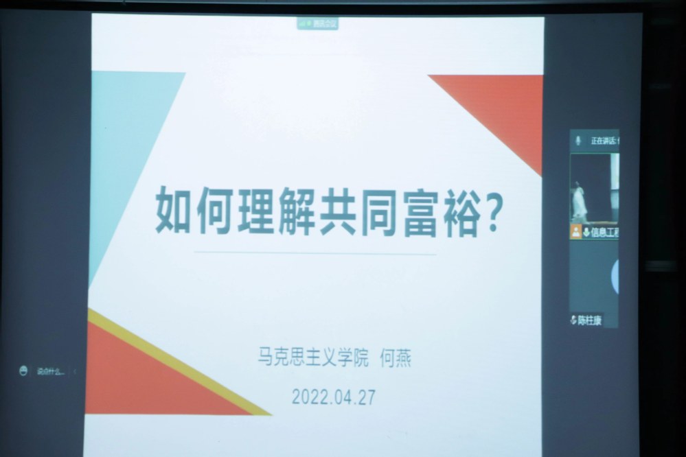 何燕老师通过四个问题“什么是共同富裕”、“现阶段为何提出共同富裕”、“共同富裕示范区缘何花落浙江”以及“共同富裕中国怎么做”的阐释,带领青年学生踏上“共同富裕”的探索之旅。何老师首先强调共同富裕并非只是财富上的共同富裕也是精神生活的富裕,共同富裕不是“均贫富”,更不是“劫富济贫”。关于为何提出共同富裕,何燕老师从三个方面给出了解答:一是共同富裕植根萌发于中华民族关于大同世界的美好理想,二是共同富裕蕴含于马克思恩格斯等经典作家的深邃思考和深刻洞见,三是共同富裕理念奠定于我们党百年奋斗征程。何老师分析到浙江之所以成为共同富裕示范区是因为浙江的城乡收入差距较小、民营企业发达以及浙江人吃苦耐劳、改革创新的精神。她表示为了实现”共同富裕”这个终极目标,我们应该共同奋斗,做大做好蛋糕,再促进分配改革,切好蛋糕。