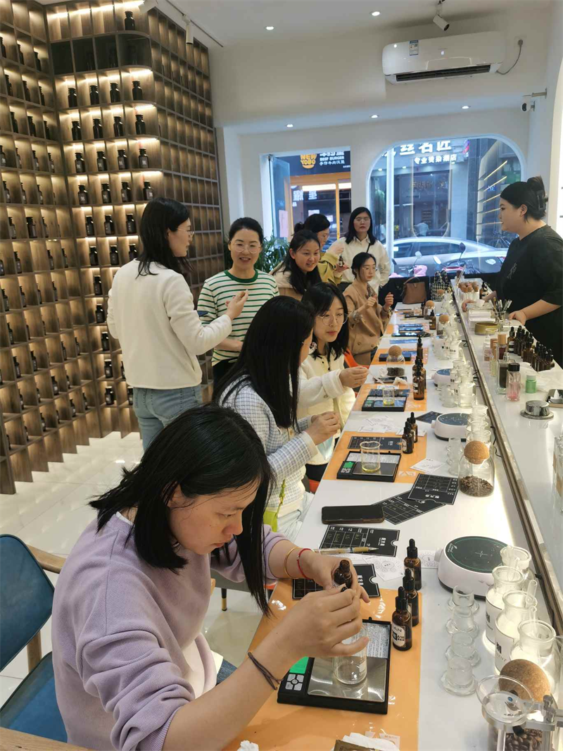 活动现场,香水调制老师向大家介绍了香水文化、各种香型的特点,以及香水的正确使用方法。大家根据自己的喜好选择好主香型和其他香型后,在香水调制老师的指导下,进行复配与试香,确定好配方表进行制作,制作出属于自己的独特礼物。
