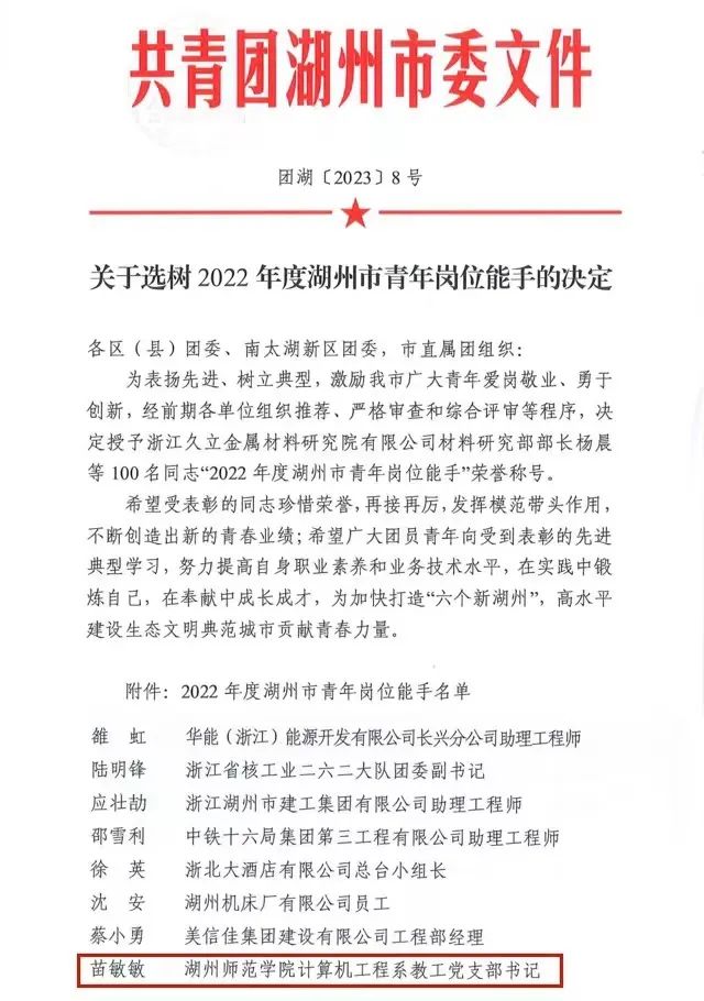 恭喜优米直播苹果app青年教师苗敏敏老师荣获2022年度湖州市青年岗位能手称号!