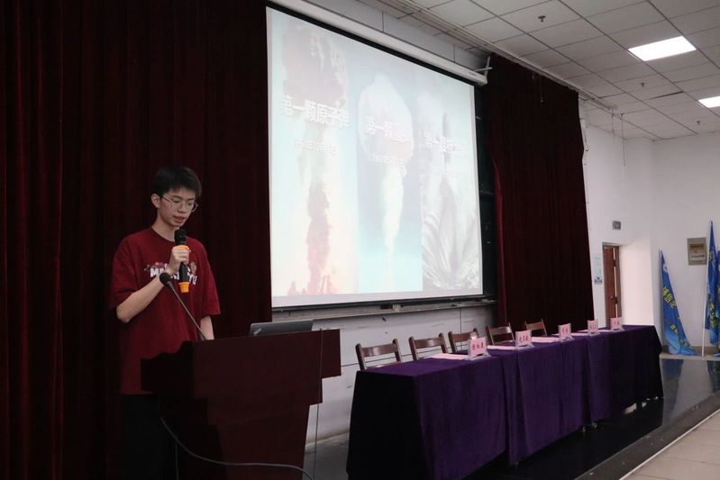 会议第一阶段议程是开展“两弹一星”精神的宣讲学习。今年上半年,学院以团委青年志愿者分站成员为主体,申报了国家“两弹一星”精神志愿宣讲团,在出征仪式开始前,“星汉灿烂,‘核’你逐梦”志愿团队的负责人陈曦同学,为大家带来“两弹一星”精神的分享学习。习近平总书记曾强调“两弹一星”精神是第一批纳入中国共产党人精神谱系的伟大精神,陈曦同学和大家分享了中国核工业发展的历程,他表示作为当代青年学生,传承、弘扬和践行好“两弹一星”精神是当之无愧的责任和使命。最后,他号召大家秉持着无私奉献的精神,在暑期社会实践中艰苦奋斗,团队间大力协同,响应党的二十大号召,闪耀青春的时代光芒,在科技创新的最前沿勇于攀登,成为敢担当、能吃苦、肯奋斗的新时代好青年。