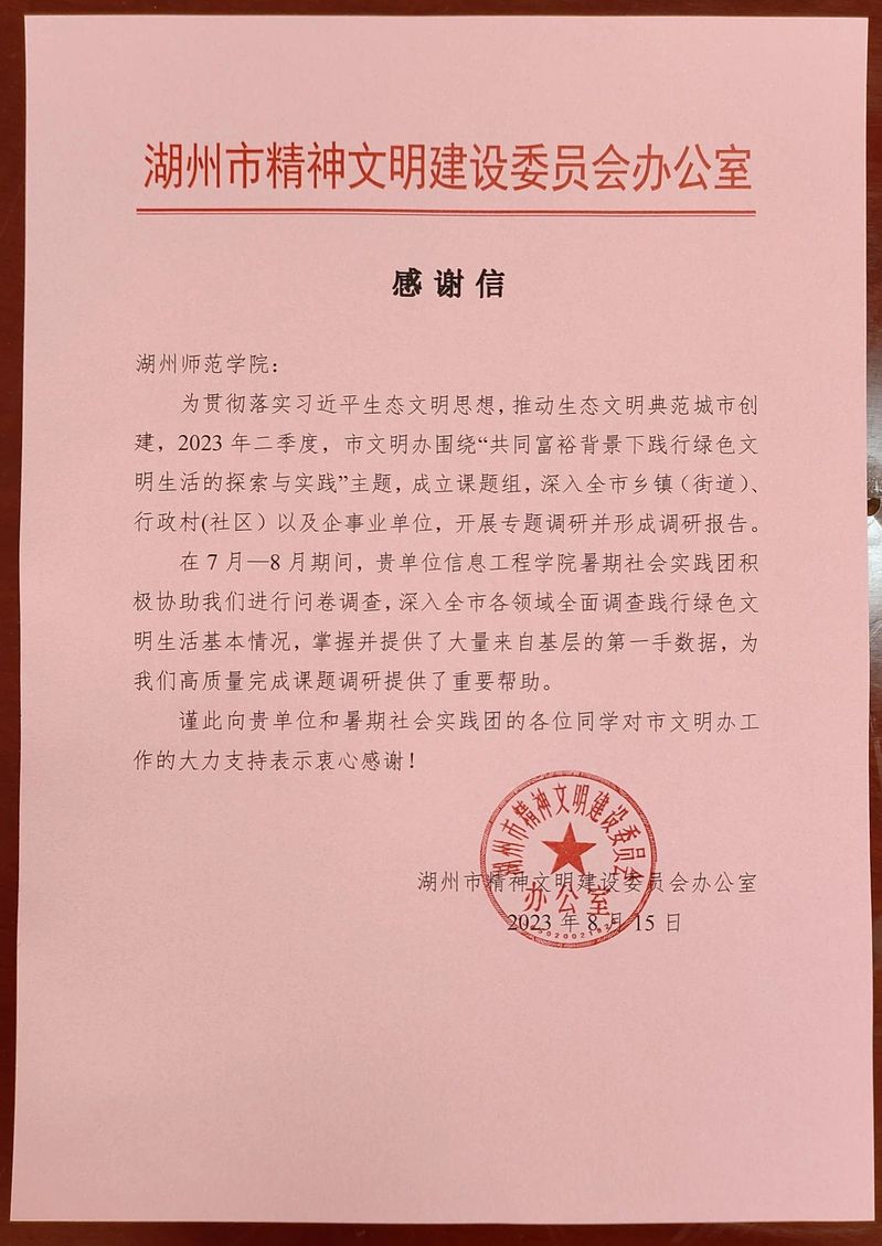 对于本次活动,湖州市精神文明建设委员会办公室表示衷心的感谢,实践团队帮助他们取得了大量来自基层的第一手数据,为他们高质量完成课题调研提供了重要帮助,推动了生态文明典范城市创建。