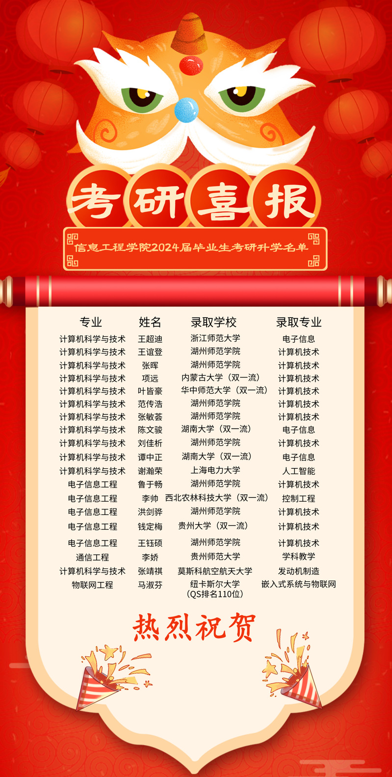 一个个色彩斑斓的青春梦想,在不舍寸功中开花结果,在日夜坚持中可感可及。希望学弟学妹们以2024届学长学姐为榜样,选择考研升学、坚定前行方向、勇攀科研高峰,用奋斗的青春书写满意答卷!