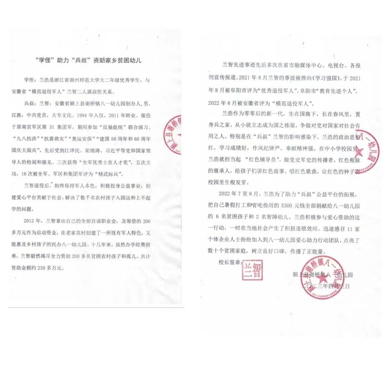 面对辛苦赚来的收入时,兰浩做出了令人敬佩的决定——全部赠予一所农村幼儿园的孩子。他表示,虽然自己经历了打工的艰辛,但从叔叔那里了解到,在老家还有许多贫困儿童和孤儿的生活和教育还处于相对困难的状态,受到叔叔投身公益事业的影响,加上自身的社会责任感和对小朋友的爱心,促使他做出了这个决定。
