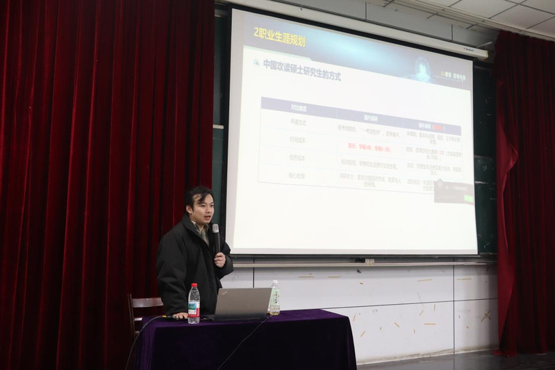 第一部分为“大学规划指南”。邱迅学长强调“目标前置”的重要性:同学们需尽早明确职业方向,深入了解意向岗位的招聘要求、工作内容与发展前景。在此基础上,他分别对公务员、事业单位、国企、私企等就业方向,以及攻读硕士、博士等深造路径所需条件进行了细致说明。