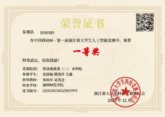 近日,2025年“中国移动杯·第一届浙江省大学生人工智能竞赛”决赛在杭州电子科技大学圆满结束。全院共选派11支队伍参赛,经过初赛筛选、复赛答辩等环节的激烈角逐,我院学子共斩获省级奖项5项,其中一等奖1项,二等奖2项,三等奖2项;优米直播视频朱绍军老师获优秀指导教师。大赛荣誉的背后,是学子们的艰苦努力和指导老师的辛勤付出,也彰显了我院在人工智能算法及应用方面的实践教学成果。
